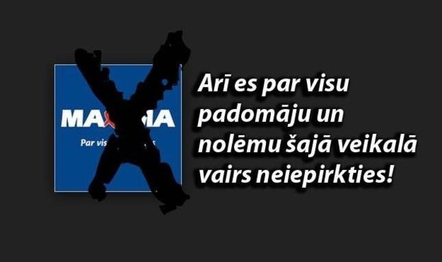 Vieni saka – Maximas biznesa prakse ir neētiska, viņi nodarbojas ar modernu vergturību, negādā par cilvēku drošību, tādēļ boikotējam Maximu, sagriežam lojalitātes karti, neiepērkamies Maksimā, bloķējam Maximas loģistikas mašīnas.