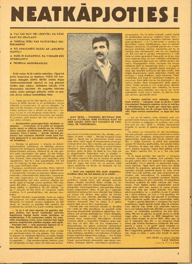 Nerimstot lasītāju interesei, esam sameklējuši vēl vienu komjaunieša Jāņa Reira interviju – šoreiz no izdevuma Liesma tai pašā 1987. gadā, kad viņš kā Rīgas elektromehāniskās rūpnīcas komjaunatnes sekretāra vietnieks ideoloģijas jautājumos bija devies uz Vissavienības komjaunatnes kongresu Maskavā. Reirs: viens no optimālākajiem variantiem, kā palīdzēt pašiem sev, ir komjauniešu politiskās mācības.