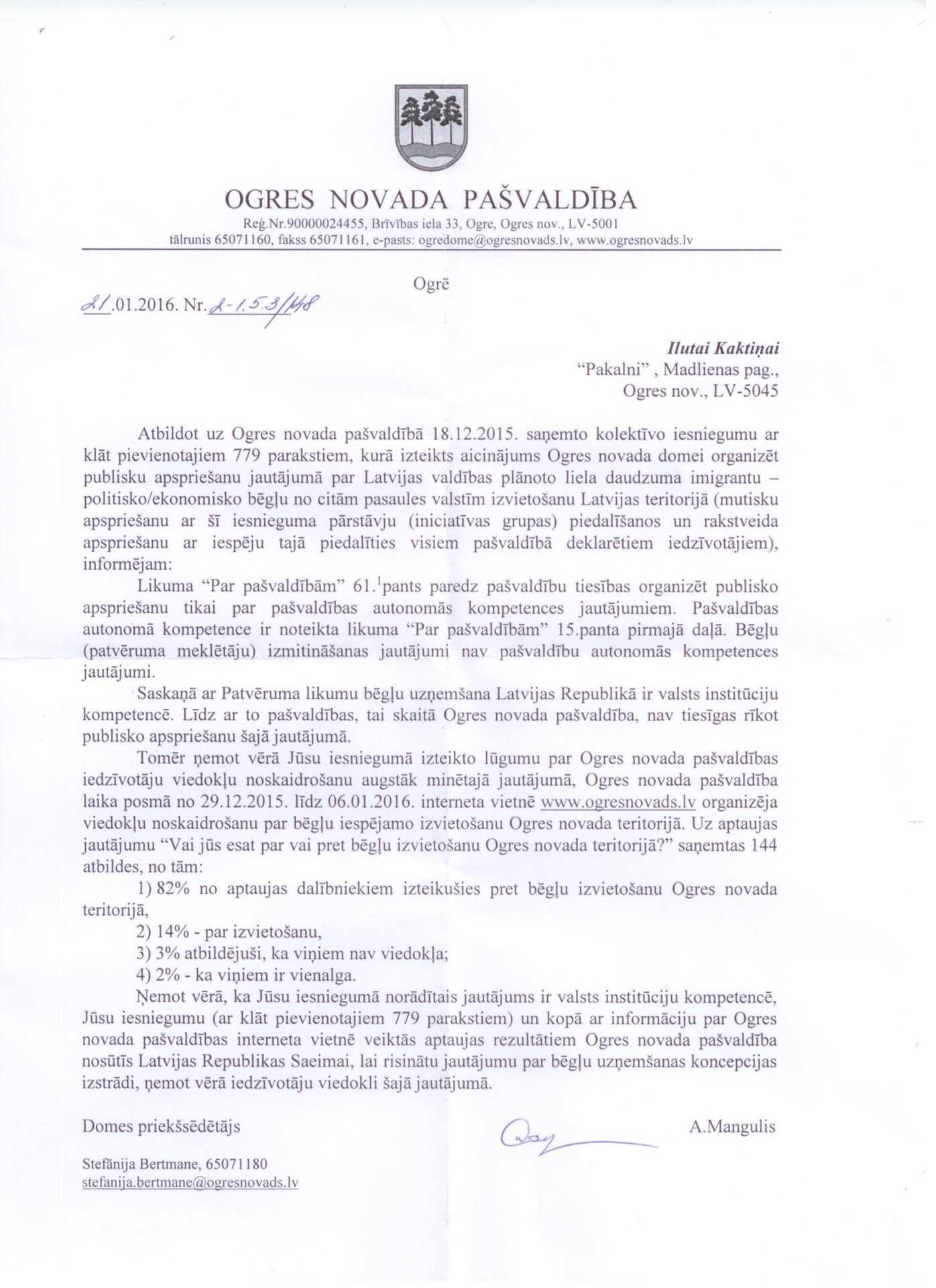 Ogres novada iedzīvotāji (kontaktpersona Iluta Kaktiņa) ir saņēmuši atbildi kolektīvajam iesniegumam (parakstījušas 779 personas) no novada domes imigrantu uzņemšanas jautājumā. Lai arī tas neatbilst patiesībai, Dome uzskata, ka šī jautājuma sabiedriskā apspriešana neietilpst pašvaldības autonomā kompetencē.