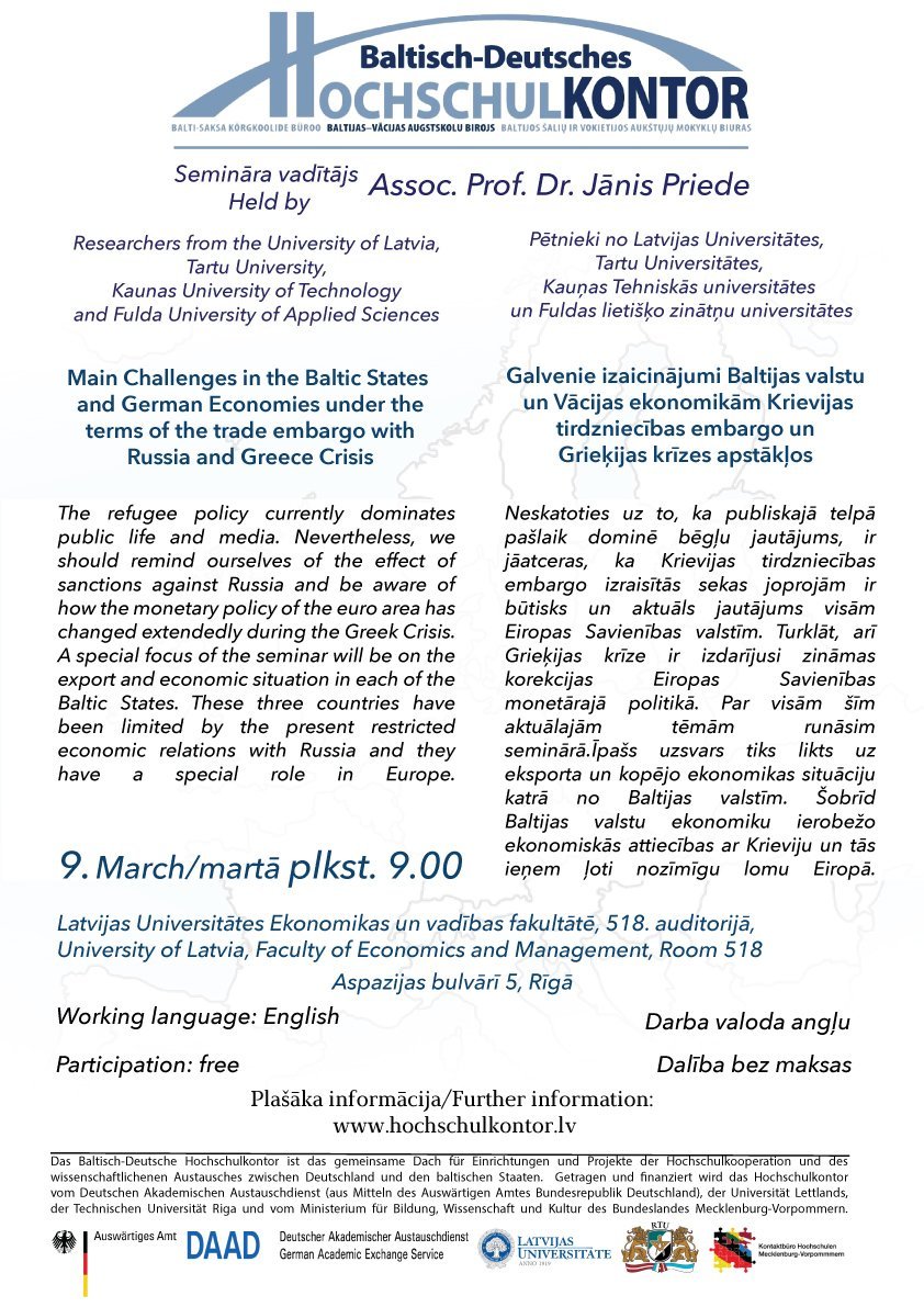 2016.gada 9. martā plkst. 9.00 Latvijas Universitātē, Ekonomikas un vadības fakultātē, 518. auditorijā, Aspazijas bulvārī 5, Rīgā, Baltijas-Vācijas Augstskolu biroja finansētā projekta ietvaros rīkots starptautisks seminārs„Galvenie izaicinājumi Baltijas valstu un Vācijas ekonomikām Krievijas tirdzniecības embargo un Grieķijas krīzes apstākļos”, kuru vadīs asoc. prof. Jānis Priede. Ieeja brīva. Angļu valodā.