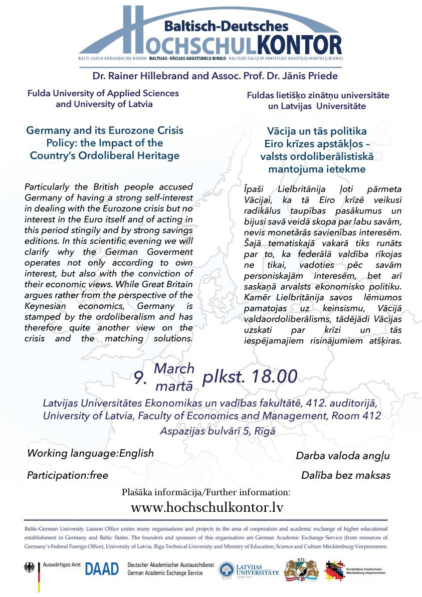 2016.gada 9. martā plkst. 18.00 Latvijas Universitātē, Ekonomikas un vadības fakultātē, 412. auditorijā, Aspazijas bulvārī 5, Rīgā, zinātniskais vakars „Vācija un tās politika Eiro krīzes apstākļos – valsts ordoliberālistiskā mantojuma ietekme” ar prof. Dr. Rainera Hillebranda (Rainer Hillebrand) un asoc. prof. Jāņa Priedes prezentācijām. Angļu valodā. Ieeja brīva.