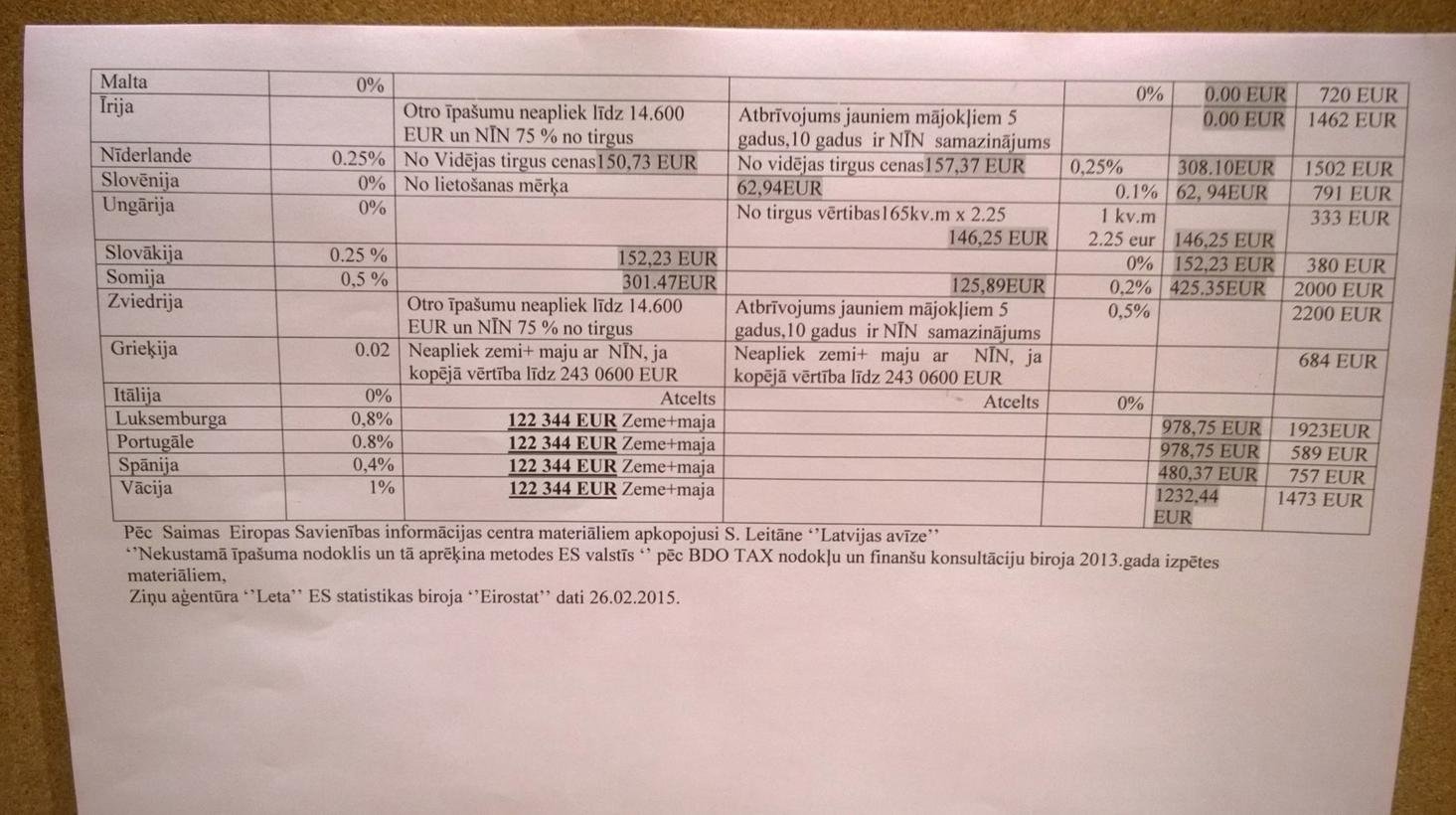 Esmu izpētījusi Eiropas Savienības valstu NĪN likmes par zemi un mājokli fiziskām personām. Lielākai daļai ES valstu, vienīgajam īpašumam (zemei un mājoklim), kurā īpašnieks dzīvo, nepiemēro NĪN , vai piemēro līdz 0,3% apmērā no zemes un mājokļa kopējās vērtības. Rīgas dome pieņēma un Vides un Pašvaldību lietu ministrija apstiprināja NĪN likmi zemei 1,5% un mājoklim 0,3% no kadastrālās vērtības, kura pielīdzināta tirgus vērtībai. Ar šo paaugstināto NĪN, Latvijā tiek pārkāptas Eiropas pilsoņa pamattiesības uz mājokli, jo nespējot samaksāt nesamērīgi lielo nodokli, tiks konfiscēts mans vienīgais , pie tam denacionalizētais īpašums (zeme un mājoklis ), un ir pārkāpts vienlīdzības princips , ar citu ES valstu pilsoņiem .ES prasījums pacelt NĪN – ir īpašumiem, kuri pelna. Šo jautājumu no 2008.gada esmu aktualizējusi Latvijā-pie tiesībsarga, Finanšu un Tieslietu ministrijās, Rīgas domē, Valsts kontrolē, Valsts zemes dienestā. Līdz šim brīdim manas pamattiesības tiek pārkāptas. Lūdzu norādīt, kur vērsties ,lai atrisinātu šo jautājumu. Klāt pievienotos attēlos var iepazīties ar NĪN piemērošanu ES valstīs!