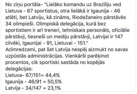 Vienkārši aprēķini pierāda, ka Latvijas delegācijā ir vismazākais sportistu īpatsvars – tikai nedaudz virs 20%, iekams kaimiņvalstu Lietuvas un Igaunijas delegācijās treneru un citu pavadošo palīgu īpatsvars ir krietni mazāks, bet sportistu īpatsvars – ap 50%.