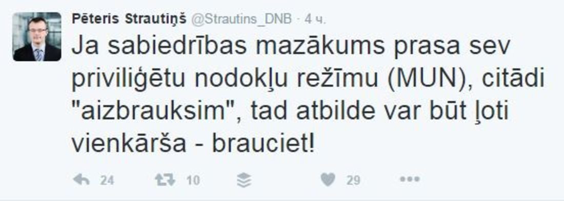 Ja sabiedrības mazākums prasa sev priviliģētu nodokļu režīmu (MUN), citādi “aizbrauksim”, tad atbilde var būt ļoti vienkārša – brauciet! Tā atbild Pēteris Strautiņš (@Strautins_DNB ; 30.11.2016)