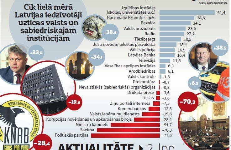 Topa trijnieks joprojām ir nemainīgs. Visvairāk iedzīvotāji uzticas izglītības iestādēm, Nacionālajiem Bruņotajiem spēkiem un baznīcai. (Reitings tiek veidots, no pozitīvo vērtējumu īpatsvara atņemot negatīvos vērtējumus.)