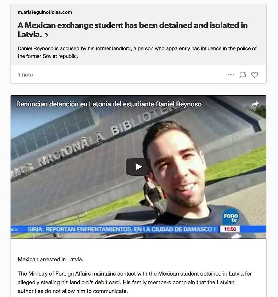 Lai vēstītu par notikušo situāciju, angļu valodā izveidots blogs ar nosaukumu Taisnu tiesu Danielam. Stāsts interneta vietnē sākas ar izklāstu par to, ka meksikānis Daniels Rejnoso šogad apmaiņas programmā sācis studēt Rīgas Tehniskajā universitātē (RTU). Jaunais vīrietis Latvijā īrējis kādu dzīvokli, taču visai drīz atklājis, ka tur ir ļoti slikti apstākļi un virtuvē esot sastopamas pat žurkas. Uzreiz pēc šiem novērojumiem students pametis īrētās telpas.