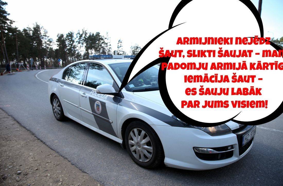 Policists vēlējās noskaidrot, kādas apliecības vēl esot apturētājam autovadītajam. Uzzinot, ka vīrietis saistīts ar armiju, policists izspļāva: “Tie, kas pa mežiem skraidelē un bezjēdzīgi šaudās!” Autovadītājs viņam paskaidrojis, ka bezjēdzīgi tas nav, turklāt “modernai karadarbībai reti vairs trenējas mežos, un šaušanas prasmes ir ļoti svarīgas”. Arī policists uz šo nav palicis atbildi parādā, paužot viedokli, ka “armijnieki nejēdz šaut, slikti šaujat – mani padomju armijā kārtīgi iemācīja šaut – es šauju labāk par jums visiem”.