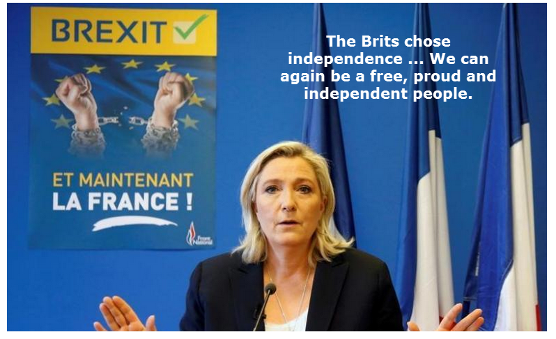 Viņa cildināja Lielbritānijas vēlētājus, kas nobalsoja par Eiropas Savienības (ES) pamešanu, un mudināja francūžus līdzināties ASV prezidenta Donalda Trampa vēlētājiem, “kas savas nacionālās intereses stādīja pirmajā vietā”.