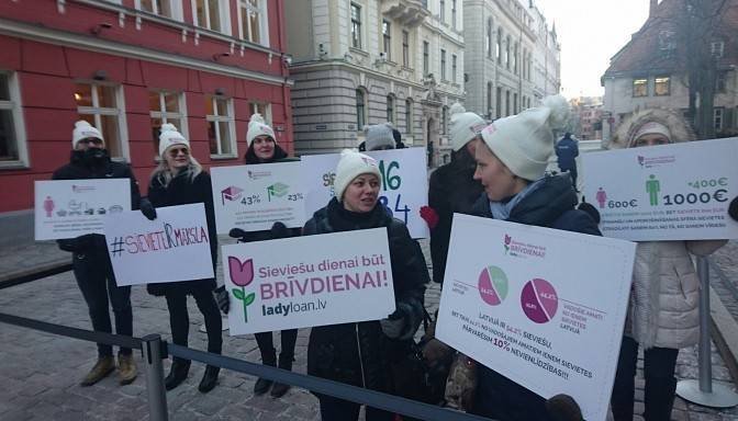 Pie Saeimas šodien norisinājās pikets ar mērķi panākt, lai sieviešu diena 8.martā tiktu noteikta par brīvdienu un vienlaikus vērst sabiedrības uzmanību uz “Latvijā valdošo dzimumu nevienlīdzību”, aģentūru LETA informēja pasākuma organizatore, “Mrs. Globe” dalībniece Liene Skulme. Pasākums pulcēja aptuveni desmit interesentus. Viņiem bija dažādi plakāti, uz kuriem bija rakstīts “Sieviešu dienai būt brīvdienai!” “#sievieteIRmāksla”, kā arī norādīts uz sieviešu un vīriešu skaita atšķirību starp deputātiem, atalgojuma un izglītības atšķirībām. Tāpat uz plakātiem, kuri bija noformēti līdzīgā stilā, un piketa dalībnieku vienādajām baltajām cepurēm bija norādes uz kādu ātro kredītu mājaslapu. Skulme aģentūrai LETA apgalvoja, ka tas saistīts ar to, ka daži domubiedri pārstāv šo uzņēmumu. Viņa arī uzsvēra, ka šis pasākums nekādā veidā nav saistīts ar uzņēmuma iespējamo reklāmu, bet gan rīkots iniciatīvas atbalstam. Tvitera lietotāji ir pretējās domās un nosoda uzņēmumu, kas sava tēla veidošanai un popularitātes veicināšanai izmantojis šādu piegājienu.