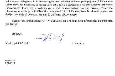 Ivara Beltes vadītā Latvijas Televīzija (LTV) oficiāli paziņojusi, ka nevēlas atklāt savas līgumattiecības ar Rīgas pašvaldību, jo LTV vadība uzskatot, ka, sniedzot pakalpojumus Rīgas domei, LTV nav veikusi valsts pārvaldes funkcijas, kā arī nav pildījusi sabiedrisko pasūtījumu, – šāds ir LTV oficiālais skaidrojums.