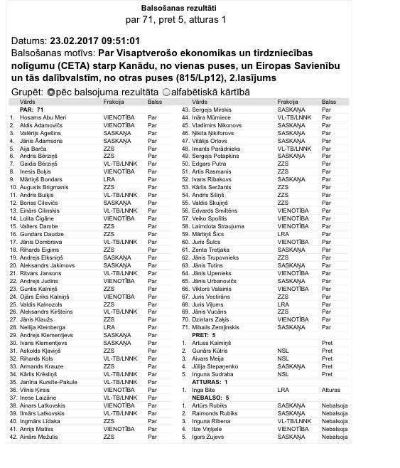 Kanādas augsto amatpersonu smaids izrādās svarīgāks par tautas interesēm: balsojums par CETA Saeimā – 71 par, 5 pret, 1 atturas