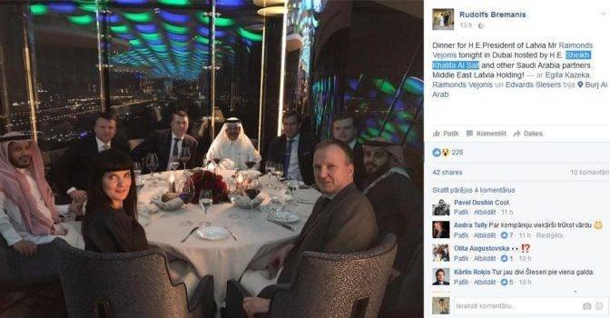 Tvitera lietotāji turpina izteikt viedokli par Valsts prezidenta Raimonda Vējoņa Dubaijas viesnīcā notikušajām vakariņām, kurās piedalījās pašmāju diplomāti, uzņēmējs Ainārs Šlesers ar dēlu un Saūda Arābijas šeihi. Latvijas Televīzijas raidījums “de facto” (skatīt video: https://www.youtube.com/watch?v=mwLdmFu0Z9I ) vēstīja, ka vakariņu organizēšanā roku pielicis Latvijas vēstniecības Apvienotajos Arābu Emirātos (AAE) bijušais pilnvarotais lietvedis Rūdolfs Brēmanis, kurš šādi gribējis veicināt arābu investīcijas Latvijā. Brēmanis nu kļuvis par uzņēmēju un bildes no vakariņām ar prezidentu publicējis sociālajos tīklos, šādi piesaistot uzmanību sava jaunā uzņēmuma popularizēšanai. Vaicāts, vai Vējonis konsultējās ar padomniekiem par to, vai doties uz tikšanos, kuras dalībnieku sastāvu viņš nezinot, prezidents norādīja, ka “tās ir vakariņas, un es eju uz vakariņām jebkuras vizītes laikā”. Prezidenta rīcība šķiet neizprotama daudziem tvitera lietotājiem.