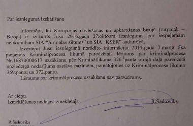 Jūrmalas pašvaldībā jau kārtējais skandāls pārgājis kriminālprocesa stadijā, – Korupcijas novēršanas un apkarošanas birojs (KNAB) ir sācis kriminālprocesu par tirgošanos ar ietekmi saistībā ar amatpersonu iespējamo korupciju un Jūrmalas pašvaldības uzņēmuma Jūrmalas siltums nepamatoti sadārdzinātu šķeldas iepirkumu un darījumu attiecībām ar SIA KSER.