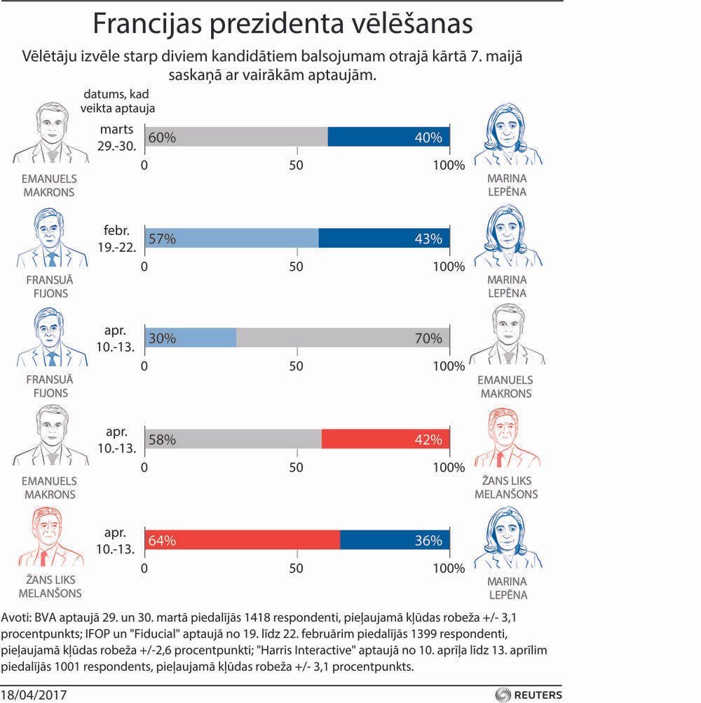 Tomēr pēdējās dienās pirms vēlēšanu pirmās kārtas, kas notiks 23.aprīlī, abu favorītu reitingi ir nedaudz kritušies, salīdzinot ar iepriekšējām aptaujām.