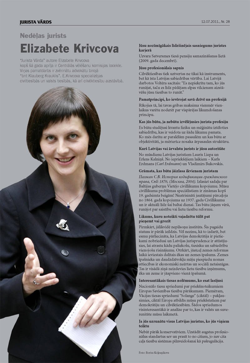 “Uz šo brīdi esmu spiesta secināt, ka tiesas kontroles par valsts drošības iestāžu darbību Latvijā neeksistē. Tas nozīmē, ka specdienesti var darīt, ko vien vēlas. Manas stratēģiskās tiesvedības mērķis ir ieviest šādu kontroli. Patlaban es rakstu kasācijas sūdzību, bet nepieciešamības gadījumā esmu gatava griezties arī Eiropas Cilvēktiesību tiesā. Drošības dienestu visatļautībai nav nekā kopīga ar demokrātiskās valsts drošību. Tieši pretēji – neobjektīva un nekompetenta DP darbība apdraud valsts konstitucionālo iekārtu.” – saka juriste Elizabete Krivcova