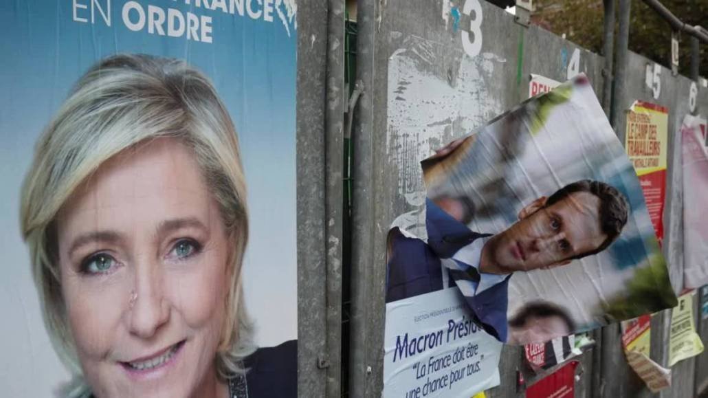 No vienas puses, uz Elizejas pils saimnieka godu pretendē centriski noskaņotais Emanuels Makrons, kas iestājas par Eiropas Savienību un cenšas aizstāvēt globalizācijas priekšrocības, bet no otras – nacionālistiskā galēji labējo kandidāte Marina Lepēna, kas sola pirmajā vietā stādīt Franciju.