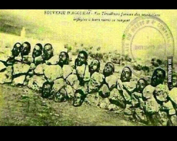 Ai, ai, ai, 1922. gada pastkarte no Alžīrijas. Alžīriešu galvas, ko veikli nošņāpuši franču karavīri. Un mēs domājām, ka ISIS to paši izdomāja. Come on, guys! Pašu savārītā zupa negaršo?