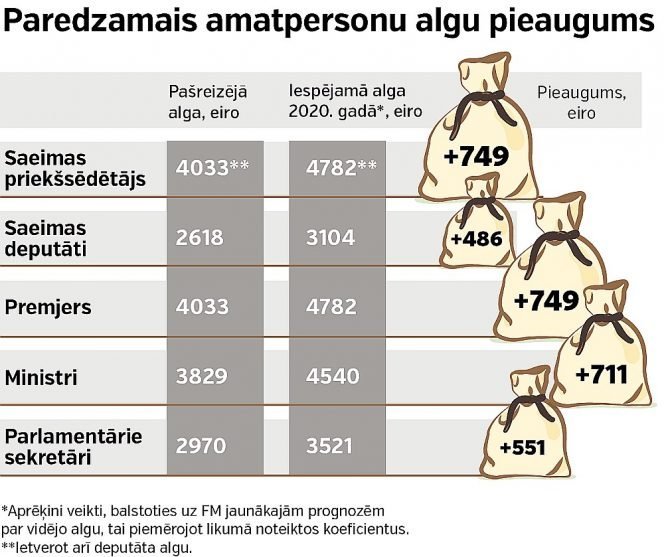 FM paredz, ka 2020.gadā tautsaimniecībā nodarbinātā vidējā bruto alga sasniegs 1072 eiro mēnesī, kas nozīmētu aptuveni 157 eiro pieaugumu pret šo gadu. Balstoties uz šo FM prognozi un veicot aprēķinus, laikraksts secina, ka ministru un premjera alga pēc nepilniem trim gadiem varētu pieaugt par 485 līdz 750 eiro.