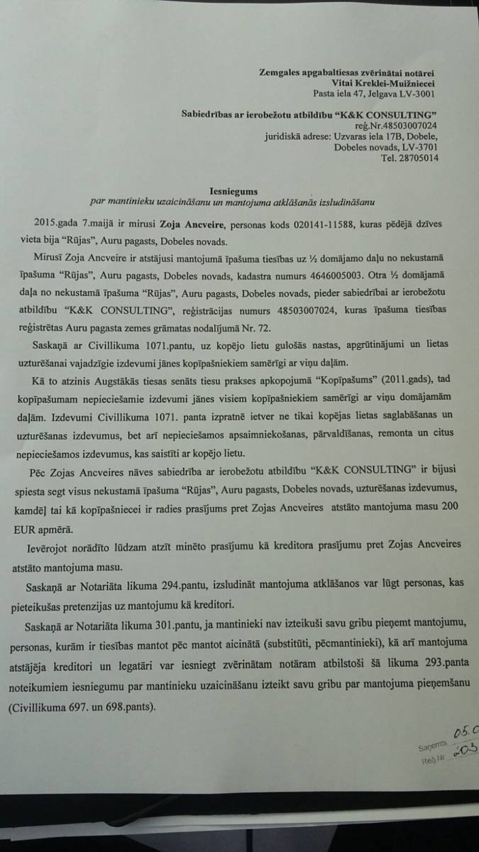 Neilgi pirms mana tēva nāves tika veikti darījumi ar manam tēvam piederošajiem nekustamajiem īpašumiem – “Mežrozes” un “Zundas 2”, kā arī veikti pārskaitījumi no mana tēva bankas kontiem. Konstatēju, ka darījumi veikti 10 dienas pirms nāves un nauda pārskaitīta 2 dienas pirms nāves.