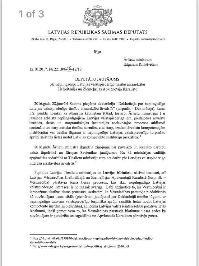 Rīga, 18.okt., LETA. Vairāki opozīcijas deputāti vērsušies ar jautājumiem Ārlietu ministrijā (ĀM) par Latvijas valstspiederīgo bērnu tiesību aizsardzību Apvienotajā Karalistē, tostarp lūdzot skaidrot Latvijas vēstnieces Baibas Bražes publiski pausto.