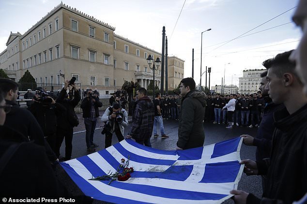 University students holding a blood-stained Greek flag from the deadly 1973 student uprising, march past the Greek Parliament, background, in Athens on Friday, Nov. 17, 2017. Several thousand people march to the U.S. Embassy in Athens under tight police security to commemorate a 1973 student uprising that was crushed by Greece’s military junta, that ruled the country from 1967-74. (AP Photo/Thanassis Stavrakis)