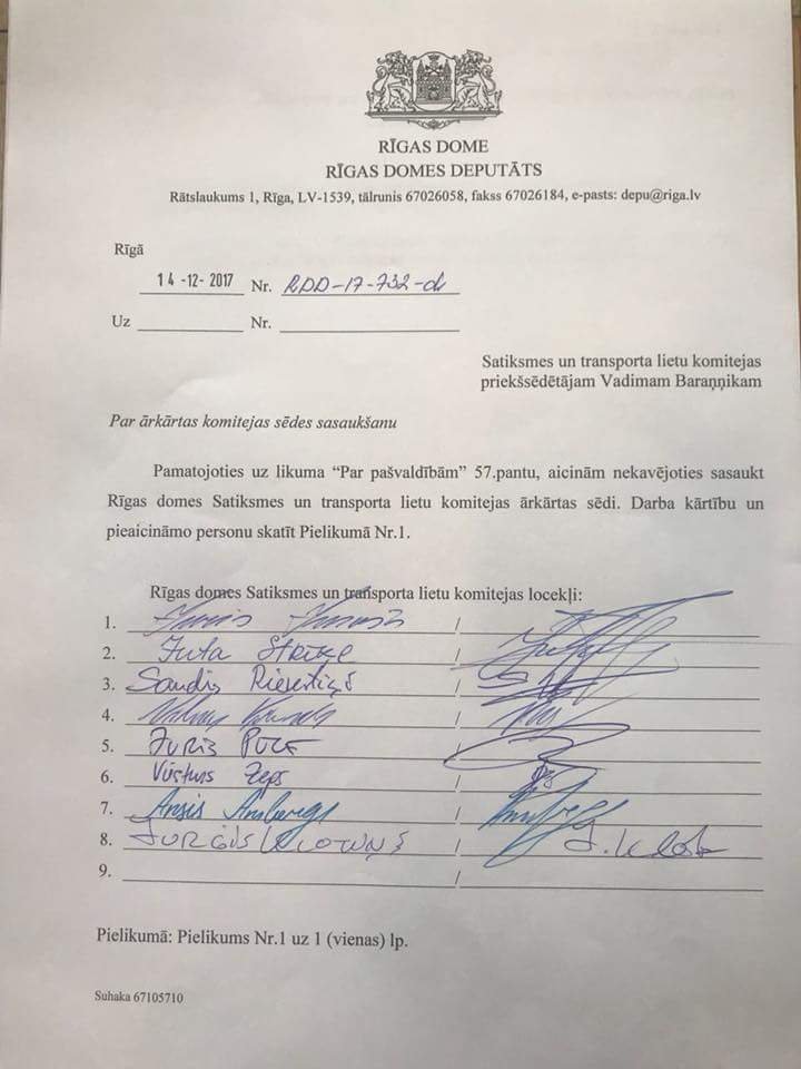Rīgas domes Satiksmes un transporta lietu komitejas opozīcijas deputāti tikko iesniedza pieteikumu par ārkārtas Komitejas sēdes sasaukšanu, lai izskatītu jautājumu par SIA “Rīgas satiksme” valdes priekšsēdētāja Leona Bemhena atbilstību ieņemamajam amatam! Kā ziņotāji aicināti – RD priekšsēdētājs N.Ušakovs un L.Bemhens!