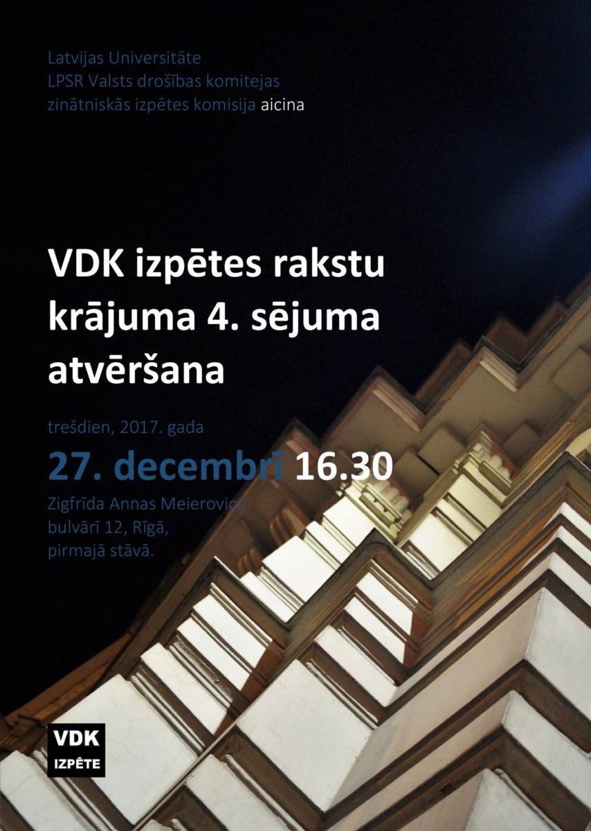 Latvijas Universitāte un LPSR Valsts drošības komitejas zinātniskās izpētes komisija aicina uz VDK zinātniskās izpētes komisijas rakstu 4. sējuma atvēršanu 2017. gada 27.decembrī plkst. 16.30. Satversmes ievadā noteikts totalitāro režīmu nosodījums. Latvijas Republikas parlaments 1991. gada 24. augustā atzina čeku par noziedzīgu organizāciju. Komisijas pienākums veikt Valsts drošības komitejas zinātnisko izpēti ir noteikts likumā Par bijušās Valsts drošības komitejas dokumentu saglabāšanu, izmantošanu un personu sadarbības fakta ar VDK konstatēšanu.