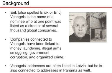 5) Bez šiem gadījumiem Ēriks Vanagels ir ticis uzskaitīts kā vēl vismaz 300 citu ofšoru īpašnieks, prezidents vai amatpersona. Neviens no šiem ofšoriem nekad nav nodarbojies ar legālu biznesu, vienīgi ekonomiskajiem noziegumiem, korupciju un iegūtās naudas legalizāciju. „Ēriks Vanagels […] ir kā preču zīme: kvalitātes un cenas simbols, tikai naudas atmazgāšanas industrijā,” raksta Dr. Andrea Galli no Ženēvā bāzētās ekonomiskās noziedzības apkarošanas grupas Scalaris.