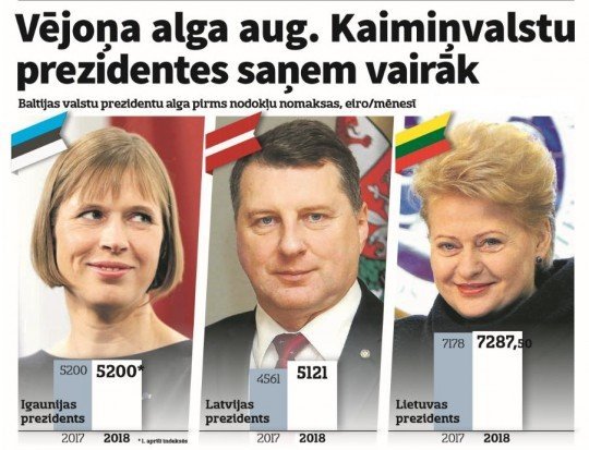 Latvijas prezidentam Raimondam Vējonim šogad mēnešalga ir noteikta 5121 eiro, kas ir par aptuveni pustūkstoti vairāk nekā pērn. Lietuvas prezidente Daļa Grībauskaite šogad algā saņems 7287,50 eiro (pirms nodokļu nomaksas), kas ir par aptuveni 100 eiro vairāk nekā pērn, Neatkarīgajai apstiprināja Lietuvas vēstniecības Latvijā pārstāvis Toms Grabausks. Salīdzinājumā ar Latviju un Igauniju D. Grībauskaite šobrīd ir vislabāk atalgotā prezidente no Baltijas valstu prezidentiem. Igaunijas prezidentei Kersti Kaljulaidai alga šobrīd ir 5200 eiro, liecina informācija Igaunijas prezidenta mājaslapā. Šāda alga K. Kaljulaidai būs vismaz līdz 1. aprīlim, kad Igaunijā kā ik gadu tiks indeksēts prezidenta un citu amatpersonu atalgojums.