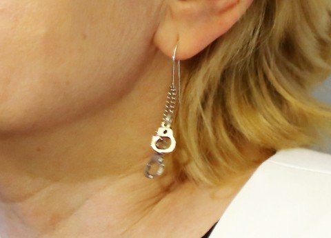 Ar šādiem jaukiem auskariem rokudzelžu formā Juta Strīķe ieradās uz “Oligarhu lietas” izmeklēšanas komisijas sēdi. (Foto: LETA)