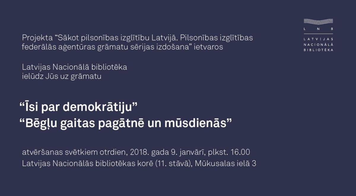 9.1.2018. plkst. 16:00 līdz 17:00 Latvijas Nacionālā bibliotēkas (LNB) korē (11. stāvā) , Mūkusalas iela 3, Riga, Latvia-1063, notiks grāmatu “Īsi par demokrātiju” un “Bēgļu gaitas pagātnē un mūsdienās” atvēršana. Dalība bez maksas.