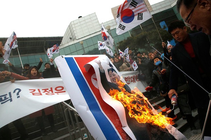 Protestētāji pie parlamenta demonstratīvi saplēsa Ziemeļkorejas līdera Kima Čenuna attēlus, taču aktīvistiem vēl nav izdevies vērā ņemami ietekmēt gatavošanos Olimpiādei, ko Seula uzskata par labu iespēju attiecību uzlabošanai ar kaimiņvalsti.