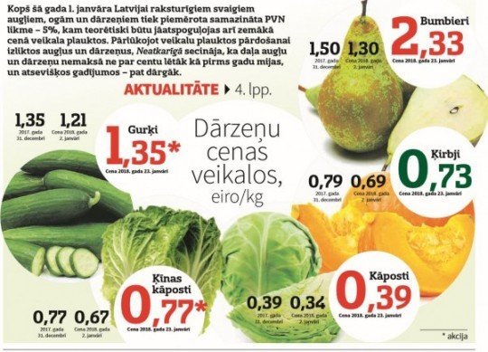 Kopš šā gada 1. janvāra Latvijai raksturīgiem svaigiem augļiem, ogām un dārzeņiem tiek piemērota samazināta PVN likme – 5%, kam teorētiski būtu jāatspoguļojas arī zemākā cenā veikala plauktos. Pārlūkojot veikalu plauktos pārdošanai izliktos augļus un dārzeņus, Neatkarīgā secināja, ka daļa augļu un dārzeņu nemaksā ne par centu lētāk kā pirms gadu mijas, un atsevišķos gadījumos – pat dārgāk.