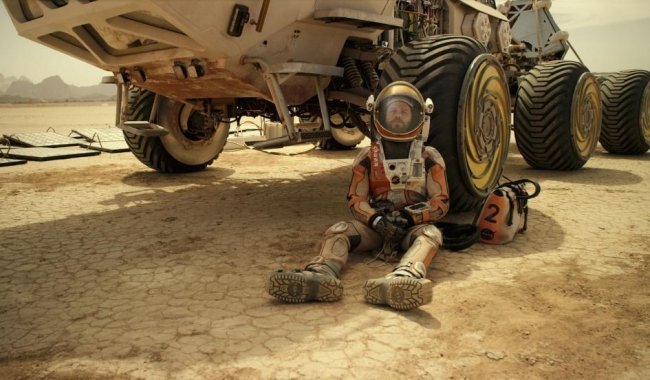 Kadrs no filmas “Marsietis”Latvijas ekonomikas modelis: viens, skafandrā, ar tanku aiz muguras, turklāt uz Marsa. Attēls: Twentieth Century Fox/Martian