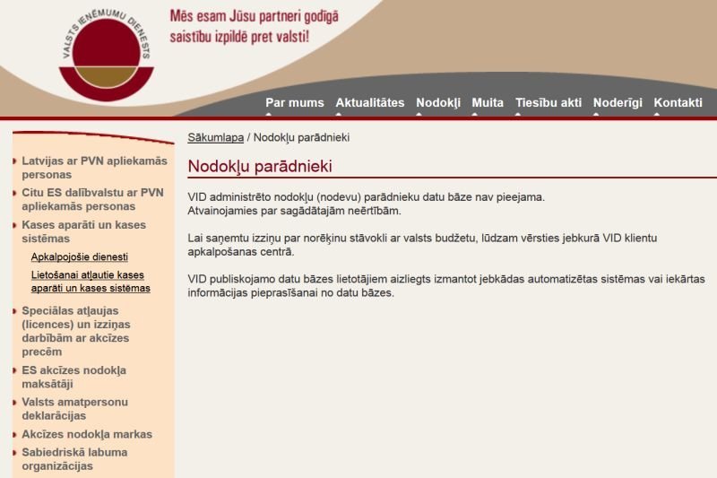 Tā vietā bija atrodams paziņojums: „Informējam, ka pašlaik tehnisku iemeslu dēļ Publiskojamās informācijas datu bāzes sistēmā nav pieejama informācija par nodokļu parādiem. Informācija tiks publicēta pēc tehnisko problēmu novēršanas. Atvainojamies par sagādātajām neērtībām!”