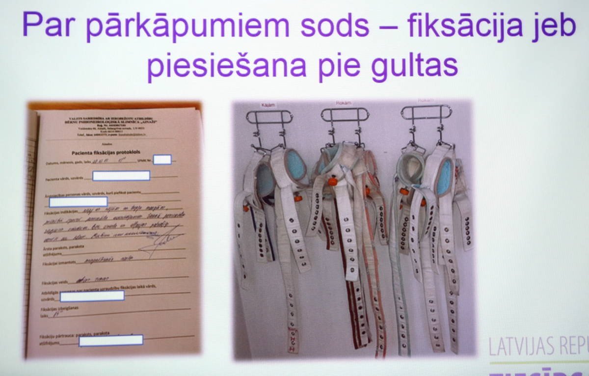 Piemēram, vienā no gadījumiem, kas nonācis arī tiesībsarga redzeslokā, meitene tika fiksēta pie gultas pēc tam, kad viņa halucināciju iespaidā bija izskrējusi no slimnīcas un tika atrasta ar asu priekšmetu sev pie kakla, grasoties izdarīt pašnāvību, pastāstīja Balode. Viņa gan nenoliedza, ka fiksēšanas varētu būt notikušas ilgāk par normatīvajos aktos pieļauto laiku – vienu stundu pēc kārtas.