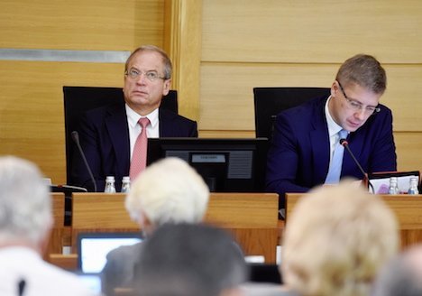 Rīgas domes (RD) priekšsēdētāja vietnieks Andris Ameriks (no kreisās) un RD priekšsēdētājs Nils Ušakovs piedalās RD sēdē, kurā lemj par pašvaldības 2018.gada budžetu.