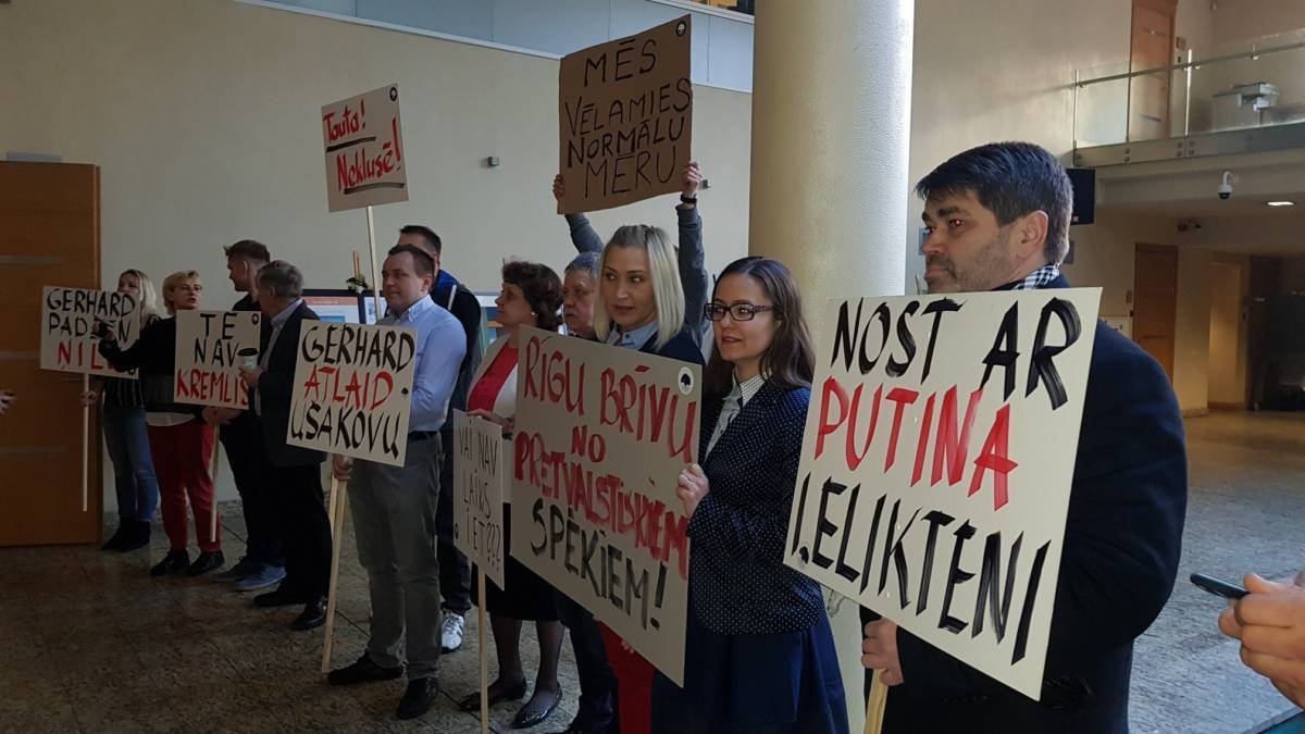 Uz plakātiem bija tādi uzraksti kā “Gerhard, padzen Ņilu”, “Nost ar Putina ielikteni”, “Vai nav laiks iet?” un citi. Protestētāji vēlāk turpināja piedalīties arī domes sēdē.