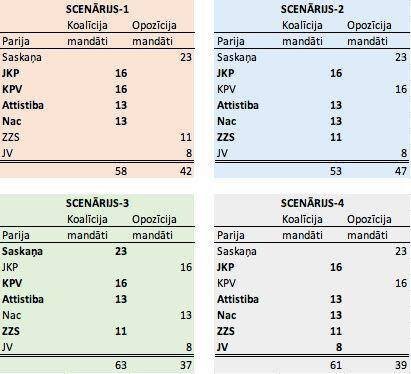 Neoficiālās sarunās ar aģentūru LETA politiķi atzīmēja, ka no sešām partijām, kas iekļuvušas parlamentā un varētu piedalīties valdības veidošanā, var veidoties dažādi koalīcijas varianti, kādu no politiskajiem spēkiem valdībā neiesaistot.