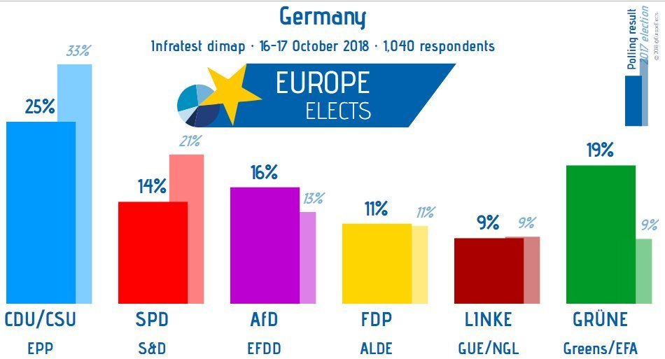Kancleres Angeles Merkeles vadītajai Kristīgi demokrātiskajai partijai (CDU) un tās māsaspartijai Bavārijā Kristīgi sociālajai savienībai (CSU) pauduši atbalstu 25% respondentu, savukārt Sociāldemokrātisko partiju (SPD) atbalstījuši 14% aptaujāto.