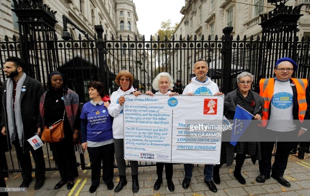 Demonstrators create a human chain along Whitehall, stretching from Parliament Square to Downing Street, the official residence of Britain’s Prime Minister, in central London on November 5, 2018, to call on the Government to clarify the position of EU nationals living in the United Kingdom, after Brexit. – Britain would remain in a temporary customs union with the EU, avoiding a hard Irish border, as part of a new deal being thrashed out between London and Brussels, according to a Sunday Times report. Senior sources told the newspaper that Prime Minister Theresa May has secured concessions from Brussels, with the EU agreeing to write an “all-UK” customs union into the divorce deal. (Photo by Tolga AKMEN / AFP) (Photo credit should read TOLGA AKMEN/AFP/Getty Images)