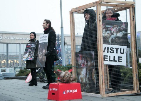 FOTO avots: http://www.protests.online/foto-vistu-elle-latvija-lietuva-un-igaunija-piketos-aicina-rimi-atteikties-no-sprostos-turetu-vistu-olu-tirdzniecibas/