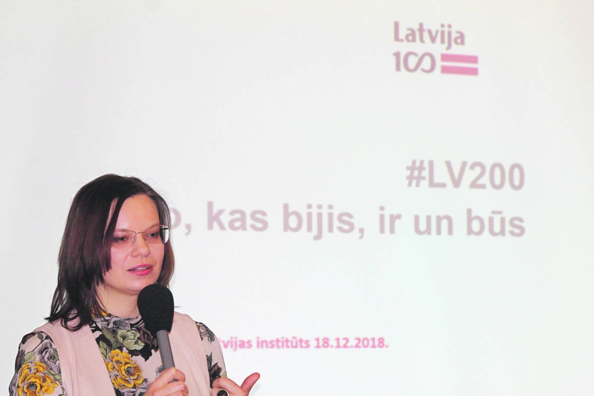NEPIEPILDĪTS PIETEIKUMS. Latvijas Institūta direktore Aiva Rozenberga sāka ar grafiski paustu pieteikumu stāstīt par to, kas būs LV 200 gados, bet reāli stāstīja tikai par to, kā iestāde apguvusi savu budžetu pēdējos pāris gados ©Arnis Kluinis