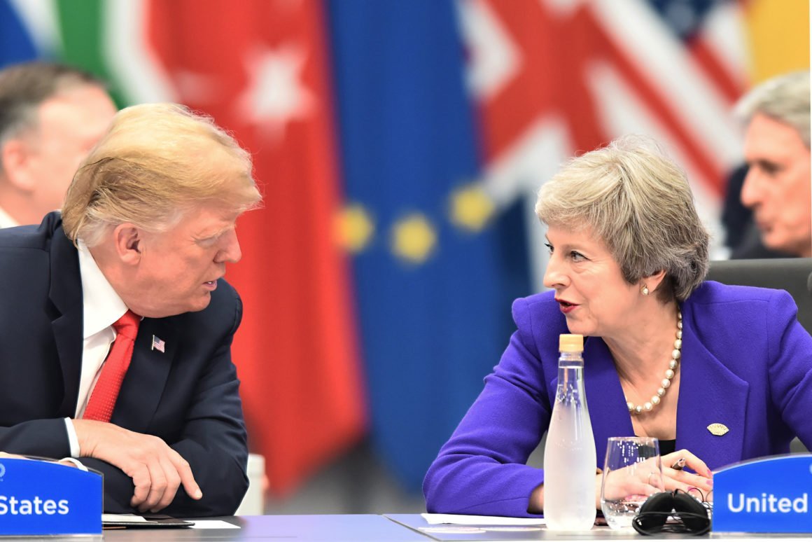 BUENOS AIRES, ARGENTINA – NOVEMBER 30: (L-R) U.S. President Donald Trump talks with British Prime Minister Theresa May during the opening day of Argentina G20 Leaders’ Summit 2018 at Costa Salguero on November 30, 2018 in Buenos Aires, Argentina. (Photo by Amilcar Orfali/Getty Images)