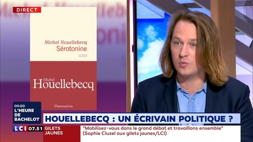 Attēla avots un VIDEO: https://www.lci.fr/politique/serotonine-le-livre-de-michel-houellebecq-fait-echo-a-la-crise-des-gilets-jaunes-2109187.html