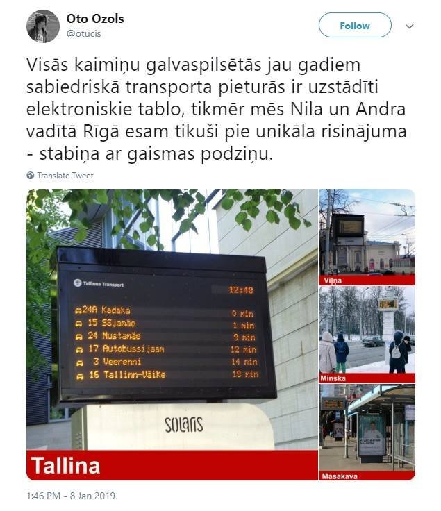 “Daudzās Eiropas pilsētās sabiedriskā transporta pieturvietas jau sen aprīkotas ar mūsdienīgiem elektroniskiem tablo, pie tam, to izmaksas ir būtiski zemākas nekā šobrīd Rīgā uzstādītās “lampiņas ar podziņu”,” pauž Bačkurs.