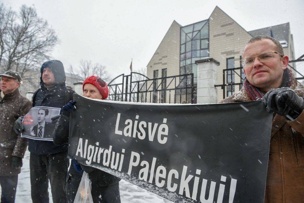 FOTO: Rīgā pie Lietuvas vēstniecības ap 40 cilvēku piketē pret Aļģirda Palecka aizturēšanu aizdomās par spiegošanu