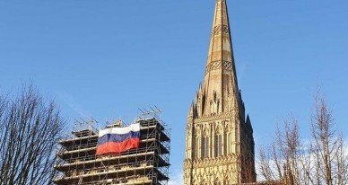 Pie Solsberijas katedrāles piekārts Krievijas karogs